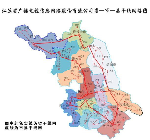 江蘇省廣播電視傳輸網(wǎng)絡(luò)由省-市-縣三級(jí)網(wǎng)絡(luò)組成,覆蓋全省13個(gè)省轄市、66個(gè)縣(市)、967個(gè)鄉(xiāng)鎮(zhèn),共2500萬戶家庭,并連接了眾多企、事業(yè)單位及商務(wù)樓宇,具備了全程全網(wǎng)、高速雙向的信息服務(wù)能力。