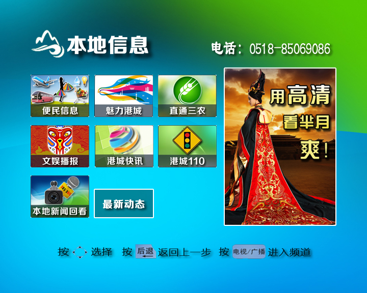 “數(shù)字電視本地信息平臺”是江蘇有線連云港分公司新近重點(diǎn)打造的服務(wù)民生、宣傳本地政務(wù)信息互動(dòng)平臺。在互動(dòng)電視中,“本地信息”與“數(shù)字電視”、“互動(dòng)電視”并列組成開機(jī)界面中的3大基本內(nèi)容。本地信息平臺帶有濃厚的本地特色,目前共設(shè)有便民信息、直通三農(nóng)、勞動(dòng)就業(yè)、文化港城、港城紅綠燈、電視商城、魅力港城、同步課件等8個(gè)版塊,每個(gè)版塊又根據(jù)內(nèi)容的不同分設(shè)不同的子欄目。